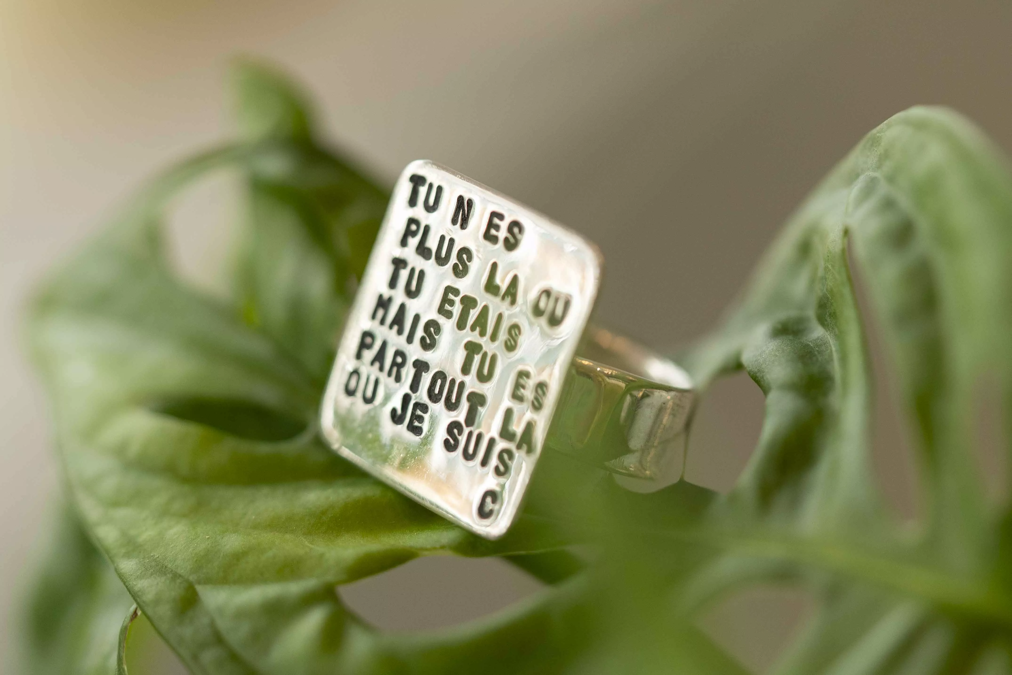 Bague personnalisable, taille et texte, argent 950, fait à Lausanne par Cindy.